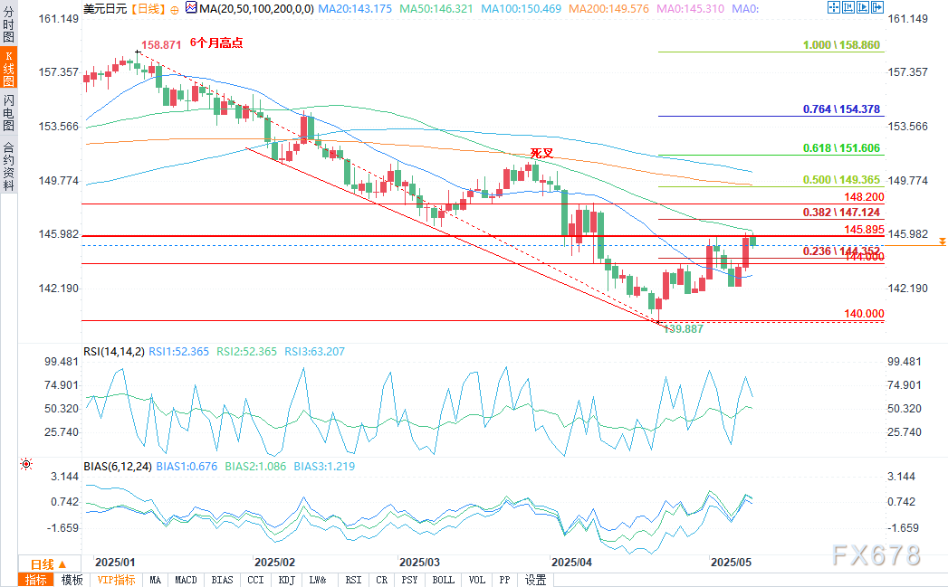 美元兑日元在周四突破了5月2日的高点145.92,但此后又回调至该水平附近,使其成为近期关键的观察水平。如果价格能够维持在该水平上方,可能会鼓励多头买入突破点,进而考验50日移动平均线,目前该均线位于146.36。突破这一均线可能会开启向148.20的上涨,该点位在今年早些时候曾充当支撑位和阻力位。如果145.92无法守住,在144.00之前几乎没有明显的支撑位。