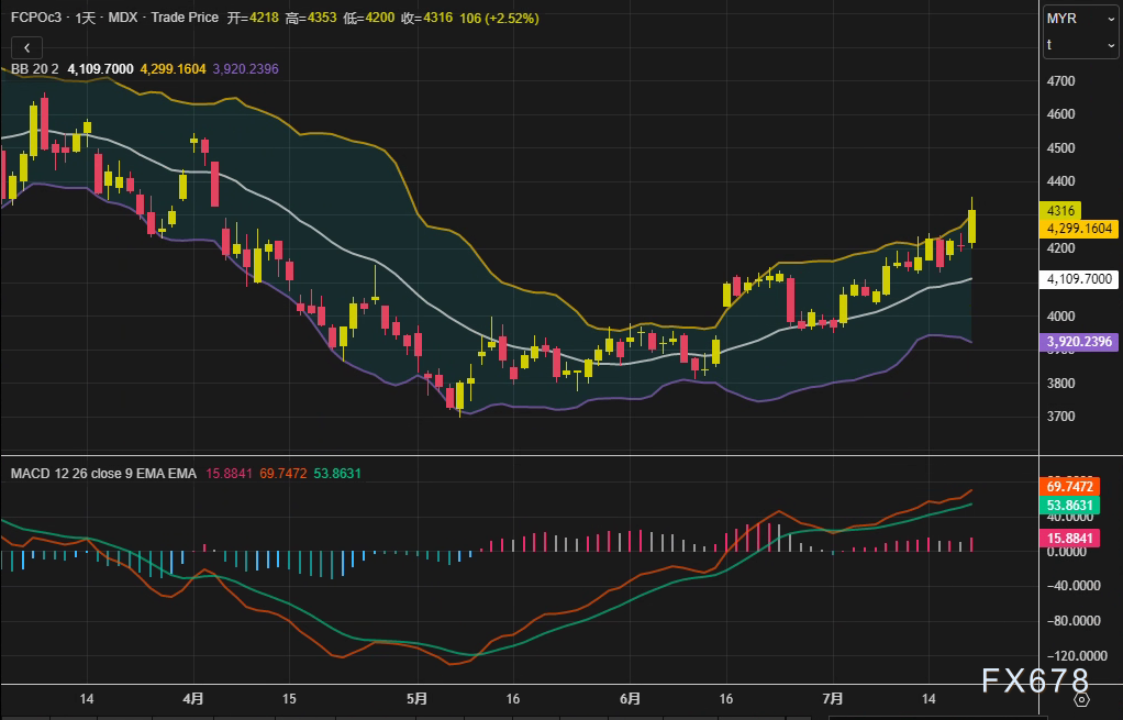 周五(7月18日),马来西亚衍生品交易所(BMD)棕榈油主力合约FCPOc3收于4316林吉特/吨,单日涨幅2.52%,周线累计上涨3.40%,创下14周以来最高收盘价。技术面上,布林通道(20,2)上轨已突破4300林吉特,MACD柱状线持续收窄,显示市场动能正在积聚。