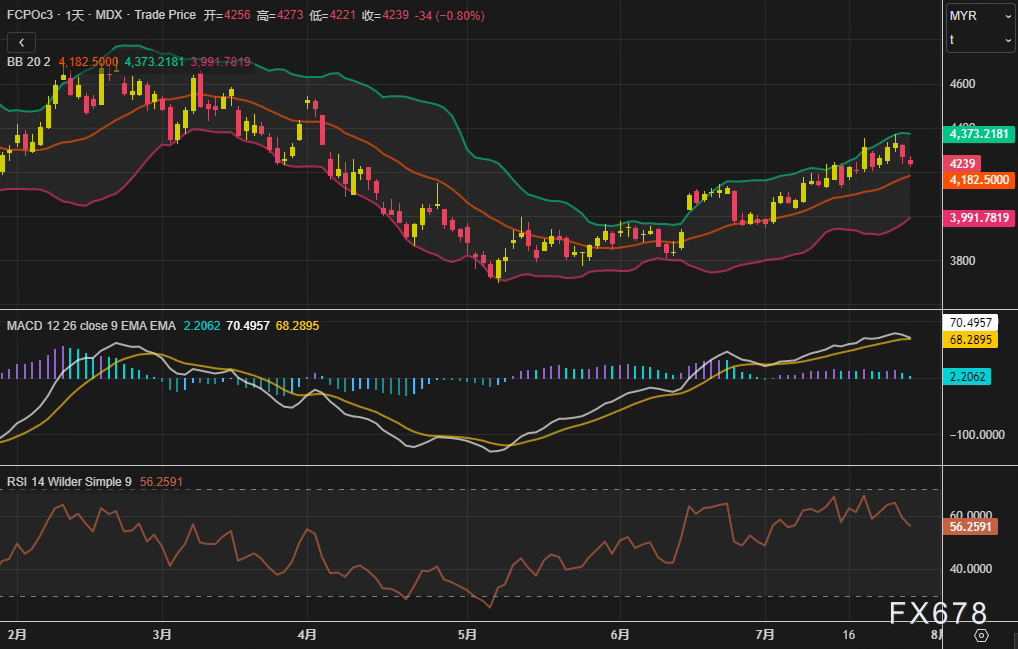 周一(7月28日),马来西亚衍生品交易所(BMD)棕榈油主力合约FCPOc3收于4239林吉特/吨,日内下跌34林吉特(0.8%),连续第二日走低。技术指标显示,价格仍处于布林通道中轨(4182林吉特)与上轨(4372林吉特)之间,但MACD柱状线缩窄且RSI(56.26)中性偏强,暗示短期上行动能减弱。