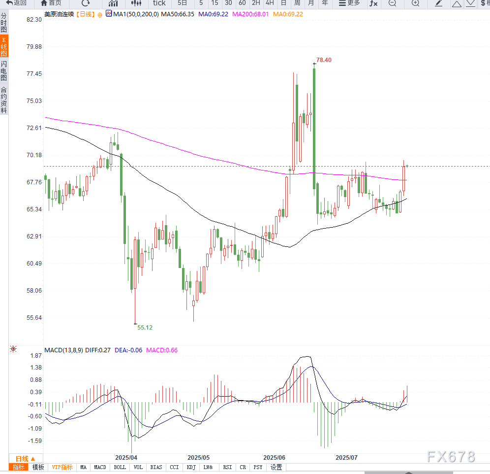 亚洲国家与印度态度分化   美国财政部长斯科特·贝森特在斯德哥尔摩与欧盟举行贸易会谈时警告,若亚洲国家继续大量购买俄罗斯原油,可能面临高额关税。   摩根大通分析师表示:“亚洲国家不太可能完全遵守美国制裁,但印度已表态将配合,这可能导致多达日均230万桶的俄罗斯原油出口受影响。”   美欧关税协议缓解经济担忧   美国与欧盟已避免贸易担忧情绪进一步升级,双方达成协议对欧洲进口商品征收15%关税,缓解经济增长前景压力,为油价提供额外支撑。   此外,委内瑞拉国有石油公司PDVSA的外国合作伙伴仍在等待美国批准在该受制裁国家恢复运营。若谈判取得进展,部分供应或回归市场,有望在一定程度上缓解价格上涨压力。   当前美原油(WTI)日线图显示,价格成功突破自6月以来的下降趋势线,并站稳在20日与50日均线上方,短期趋势已由弱转强。技术指标方面,MACD快慢线形成金叉,动能柱持续放大,RSI指标位于62附近但未进入超买区间,显示上涨动能仍具延续性。   上方关键阻力位关注71.50美元附近,若突破有望进一步上探74.00美元,下方首要支撑位在68.00美元,跌破将考验66.50美元一线。