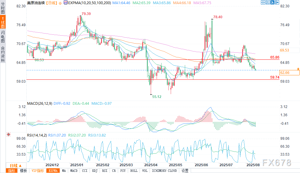 周三(8月13日),WTI原油期货承压,价格接近关键支撑位62.17美元(6月低点)。技术面情绪已明显转向看跌。交易员正关注进一步下行至5月30日低点56.91美元的可能性。若跌破该水平,可能引发更剧烈的抛售,尤其是当价格持续受制于50日均线65.86美元下方时。