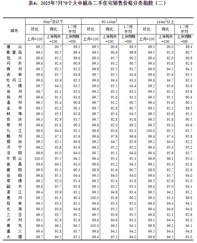 2025年7月份,70个大中城市中,各线城市商品住宅销售价格环比下降,同比降幅整体有所收窄。